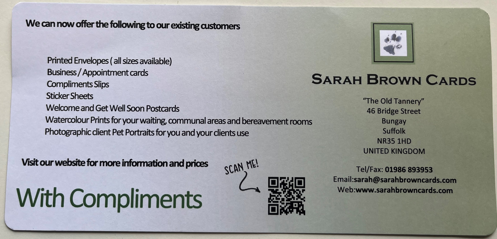 The compliment slips are fully customisable with your own logo, visuals, details and even a QR code that can link to your website.